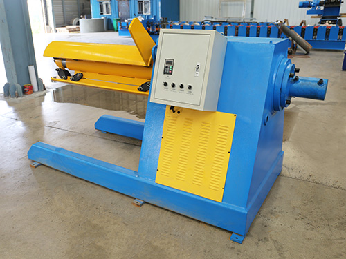 液压放料架是压瓦机开卷的的设备,机芯轴通过三或四个端面上带斜度燕尾槽连接的扇形板,每块扇形板在尾端通过一个径向滑道防止其轴向窜动,但可以实现沿径向涨缩。在卷筒轴尾端连接有旋转油缸,油缸活塞杆通过卷筒轴中心的拉杆驱动前端四棱轴轴向滑动,从而带动扇形板径向涨缩。卷筒可以通过附加的四块扇形板来增加公称直径。